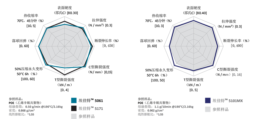 出色的發(fā)泡性能:與參照的改性劑對比中,埃佳特™ 5061,埃佳特™ 5171(左圖)和埃佳特™ 5101 MX(右圖)在關(guān)鍵特性(如壓縮永久變形,表面硬度和斷裂伸長率) 表現(xiàn)出優(yōu)異的性能。